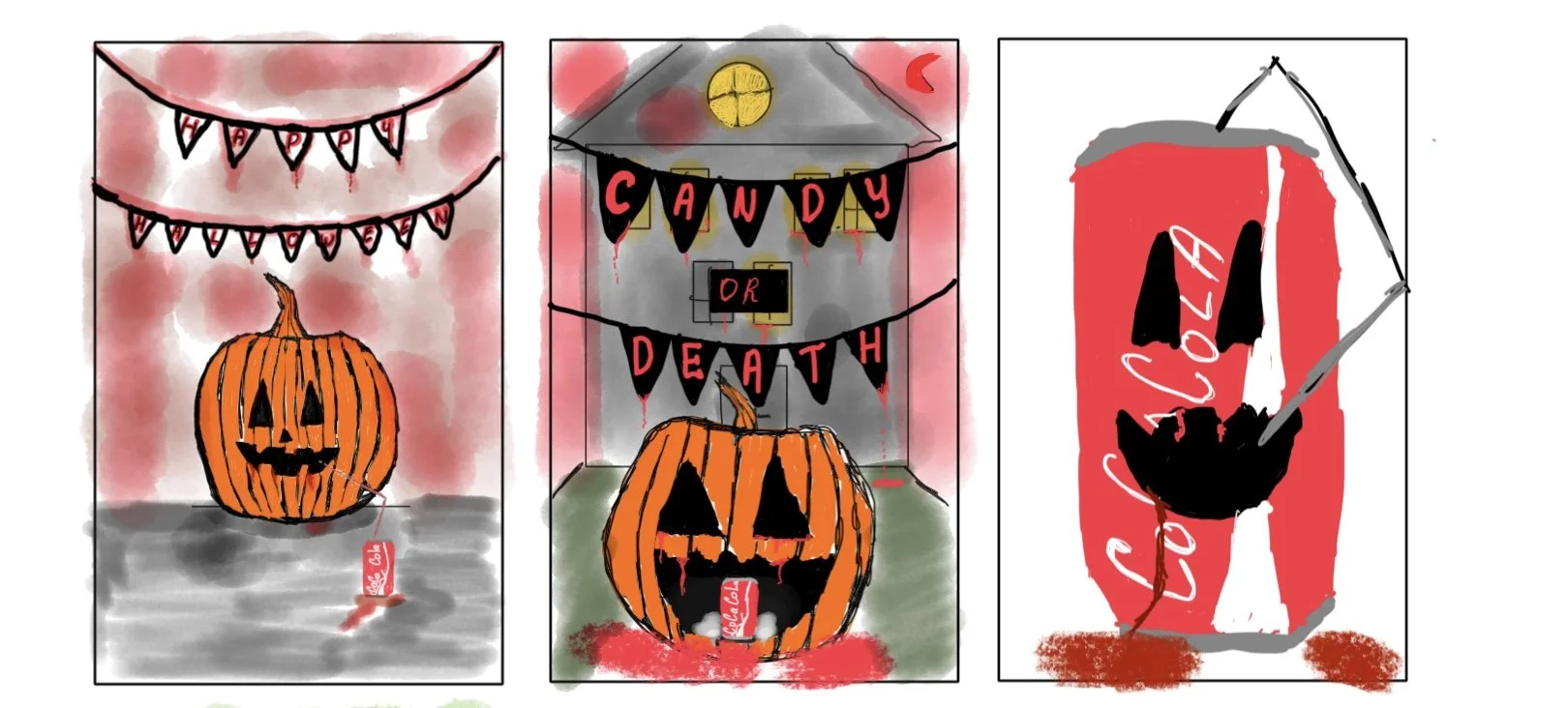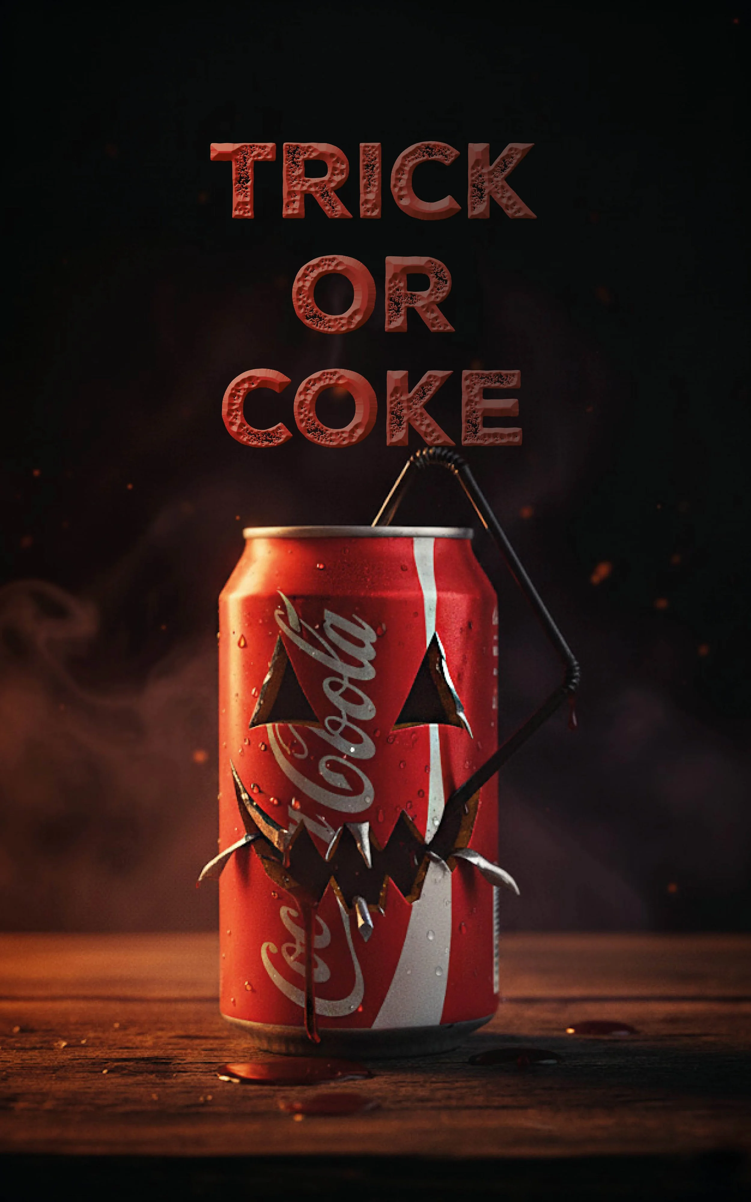 The idea behind “Trick or Coke” plays on the familiar Halloween phrase “Trick or Treat”, transforming it into a bold visual statement.The Coca-Cola can becomes the central character, cracked, sharp, and almost alive, suggesting that even something familiar can turn unexpected on Halloween night. The design explores the contrast between comfort and fear, using a well-known brand element and placing it into a darker narrative.